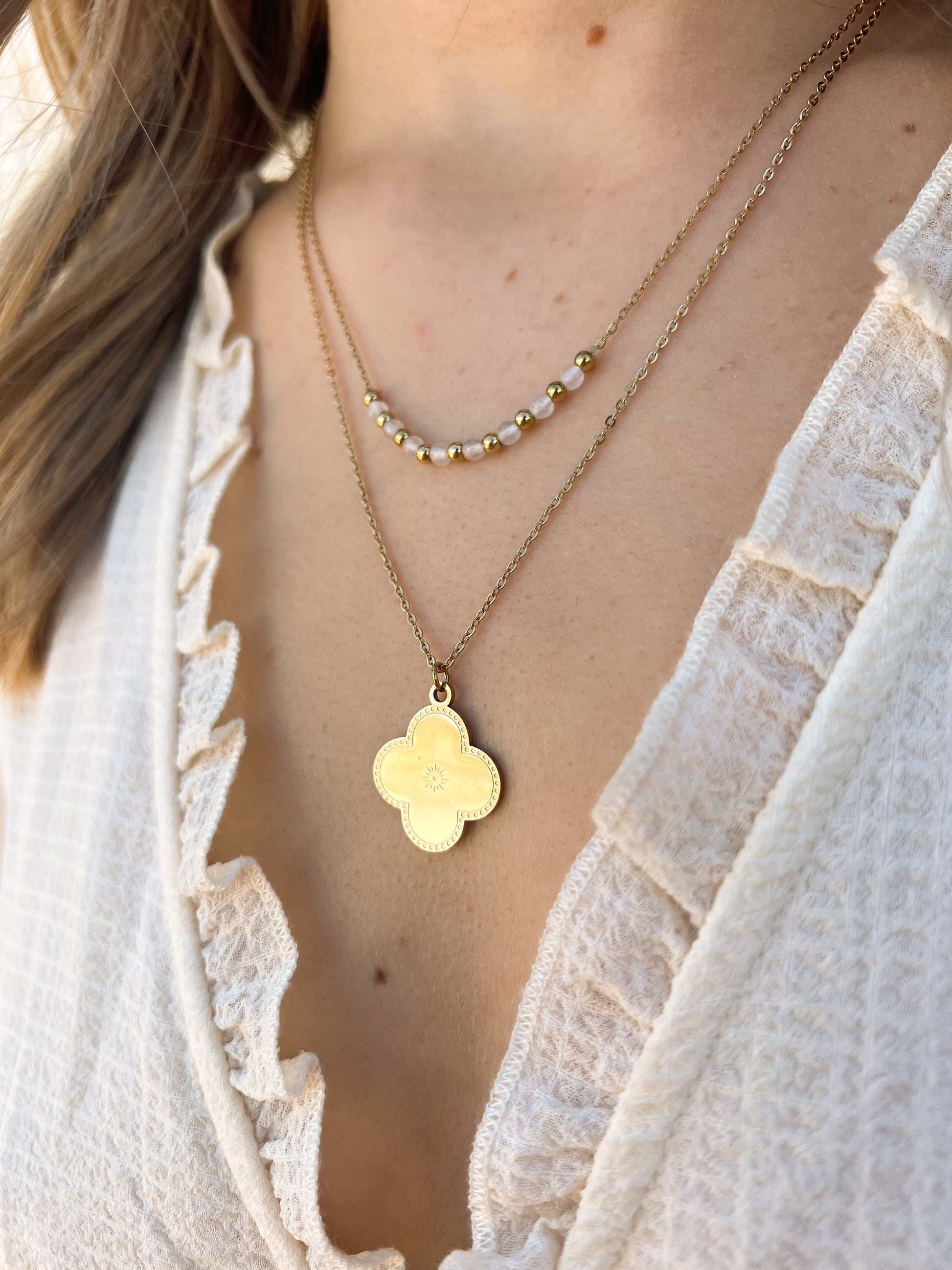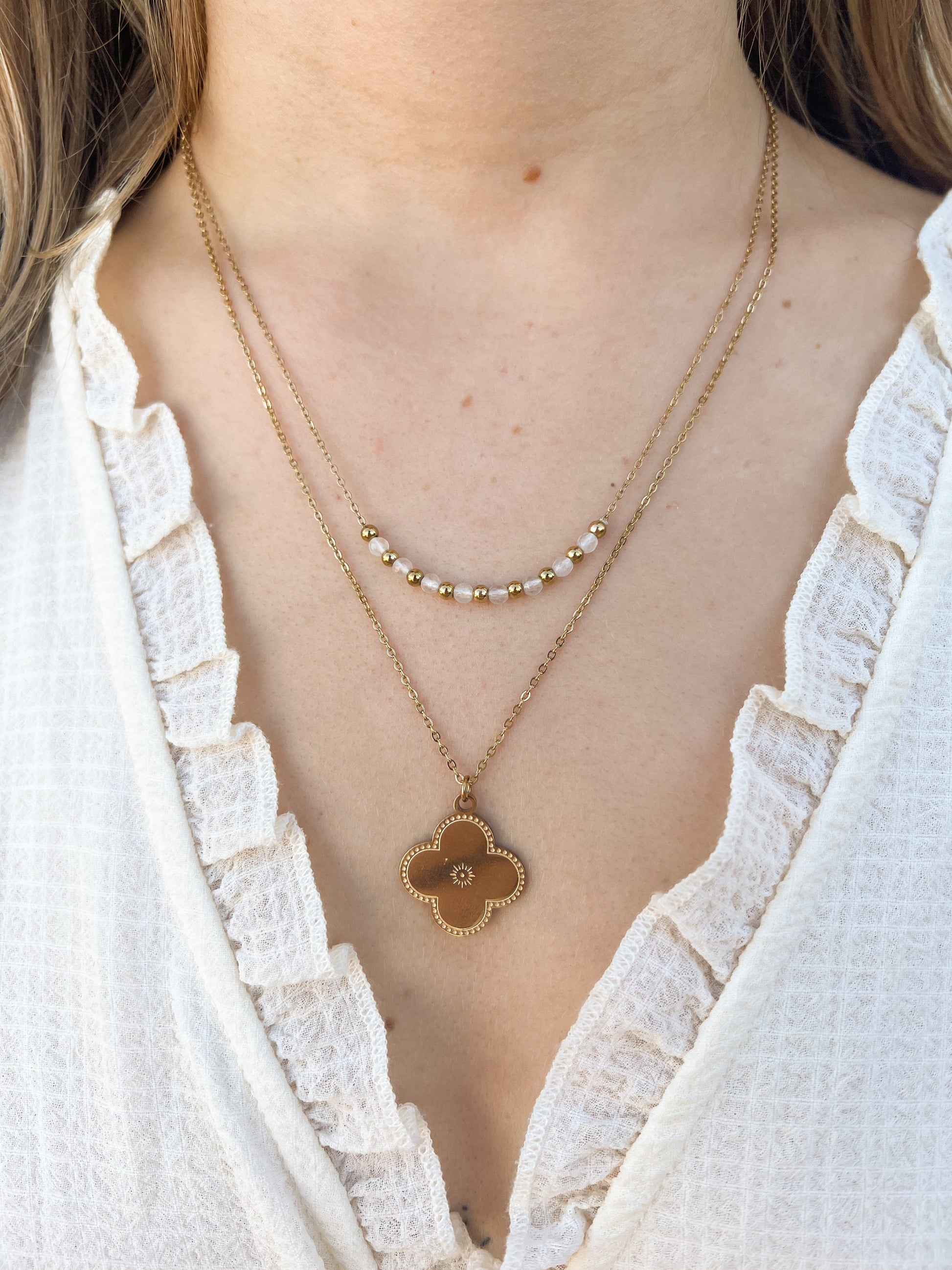Collier trèfle double chaîne blanc