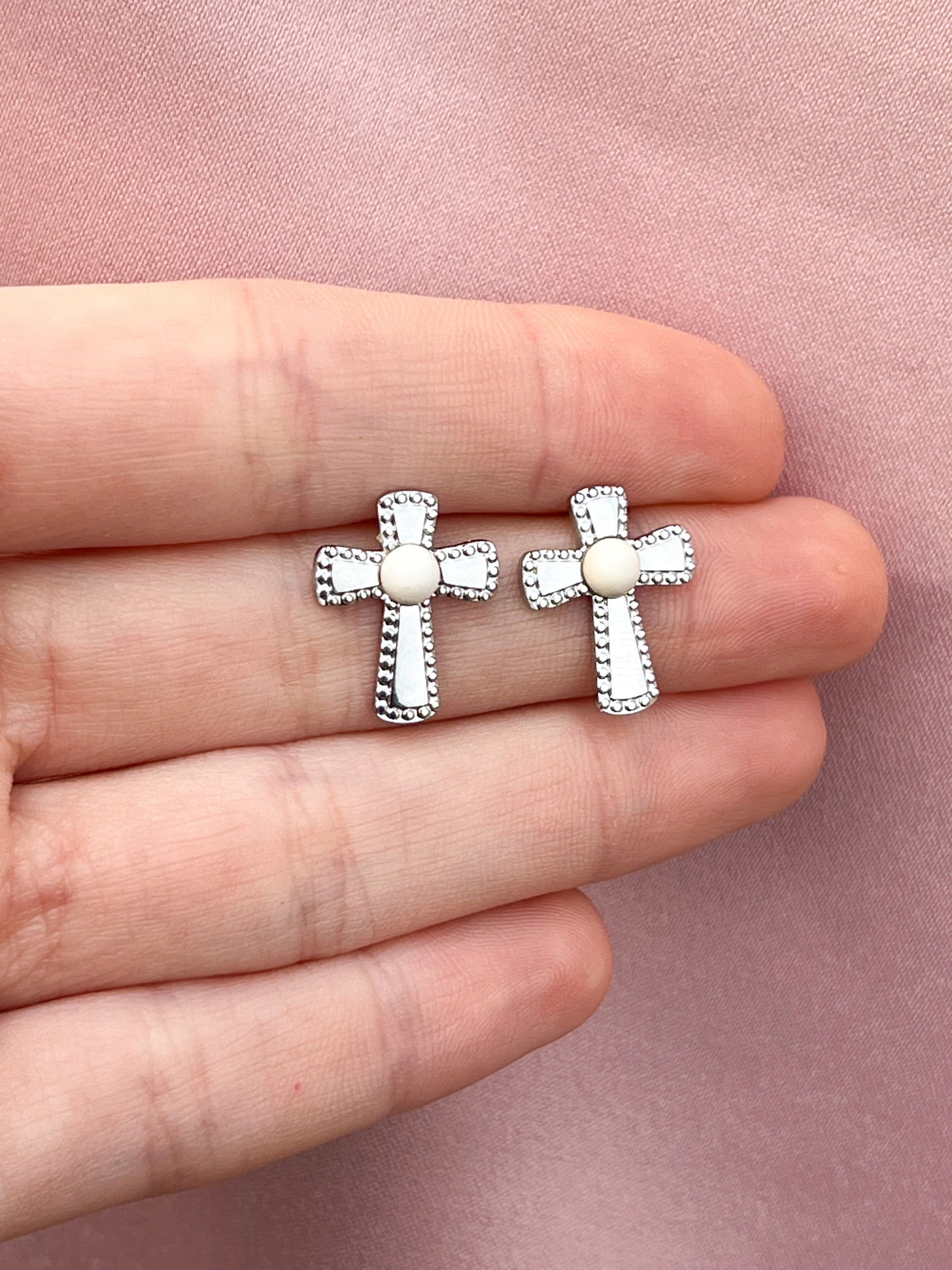 Boucles d’oreilles croix perles blanches